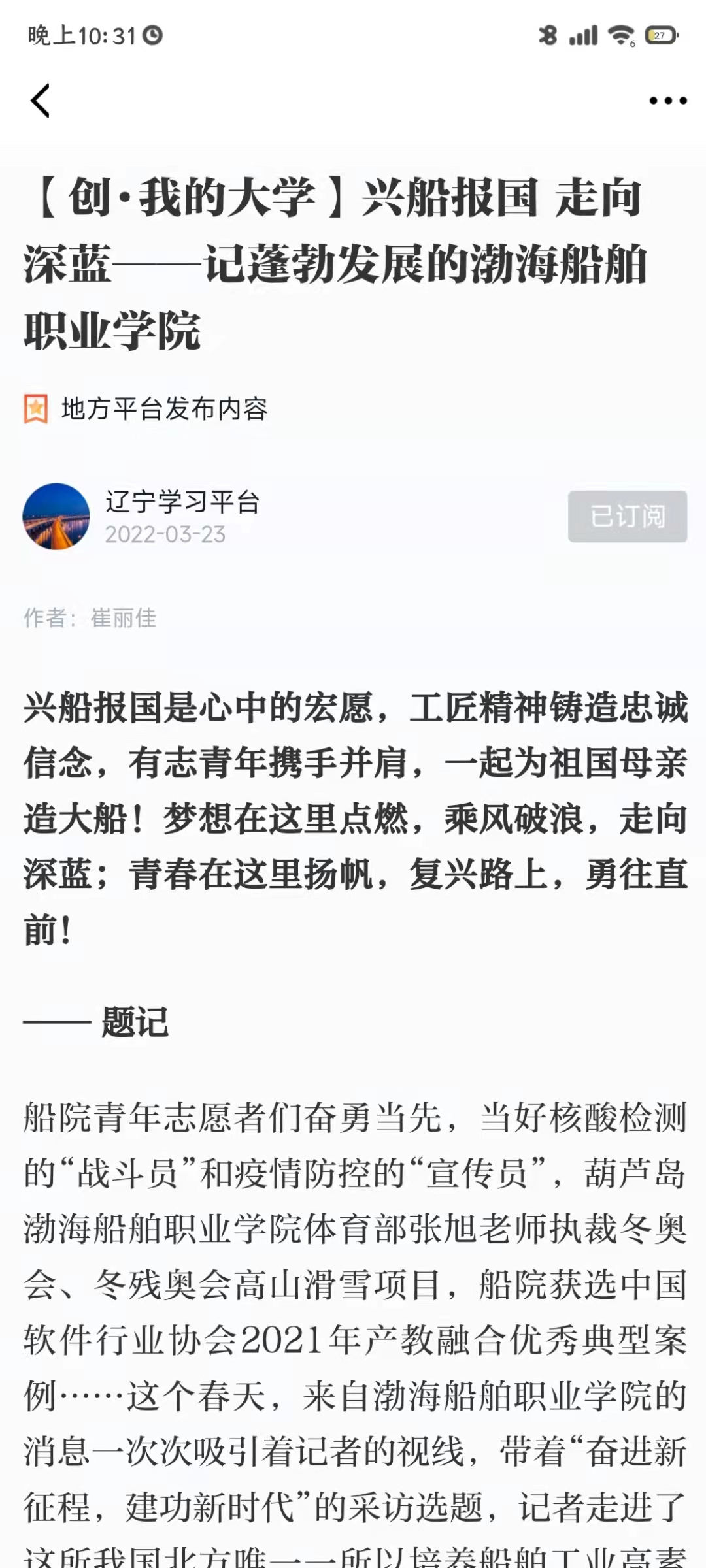 6766澳门联合网站青年志愿者们奋勇当先,当好核酸检测的“战斗员”和疫情防控的“宣传员”,6766澳门联合网站体育部张旭老师执裁冬奥会、冬残奥会高山滑雪项目,6766澳门联合网站获选中国软件行业协会2021年产教融合优秀典型案例……这个春天,来自6766澳门联合网站的消息一次次吸引着记者的视线,带着“奋进新征程,建功新时代”的采访选题,记者走进了这所我国北方唯一一所以培养船舶工业高素质技能型人才为主的国家示范性骨干高等职业学院。